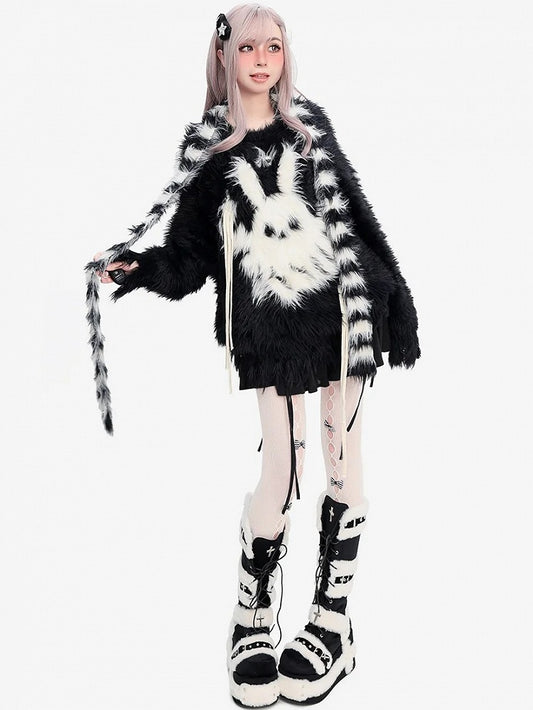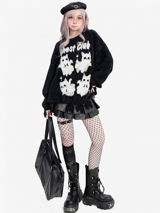 Cute Ghost Cats Distress Trim Black Soft Sweater
