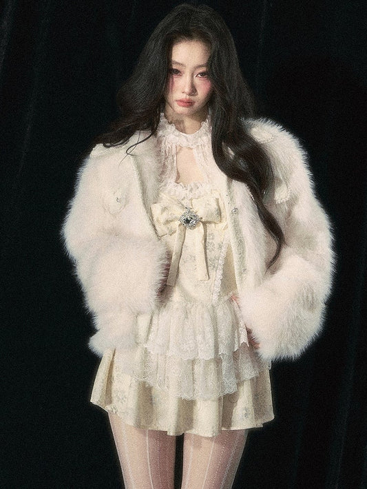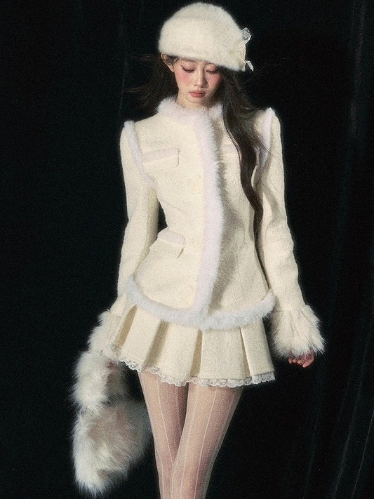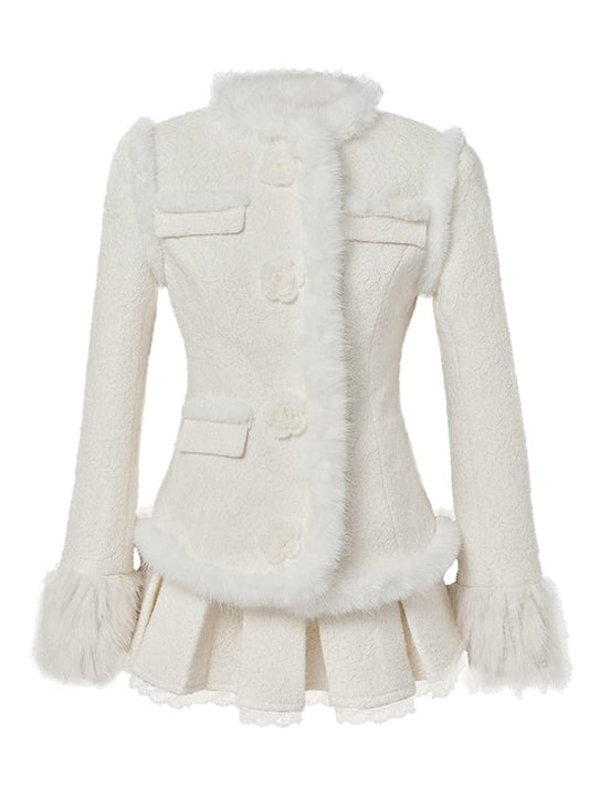 Flower Button Apricot Plush Trim Jacquard Woolen Jacket
