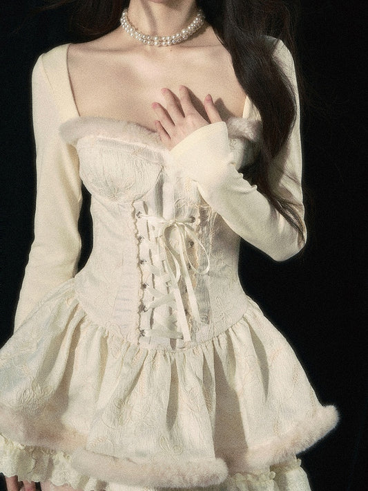 Apricot Lace-up Tiered Skirt Long Sleeves Dress
