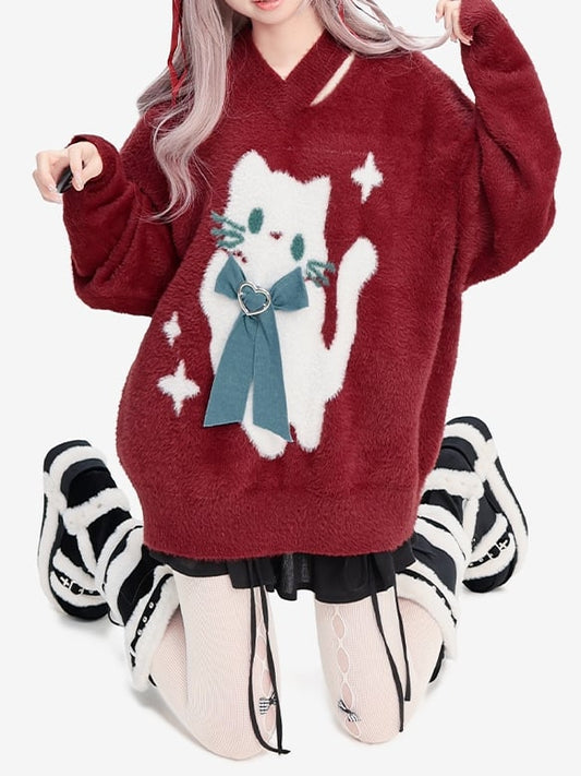 Christmas Red Cat Bowknot V-neck Soft Sweater
