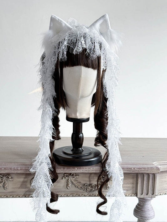 Feather-like Cat-ear Gothic and with Lace Tails Decorations Hairband Black/White Flowing
