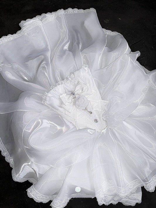 Rhinestones Balletcore Puffy Skirt White with Decorated Set Boned Corset Waist Strapless Top