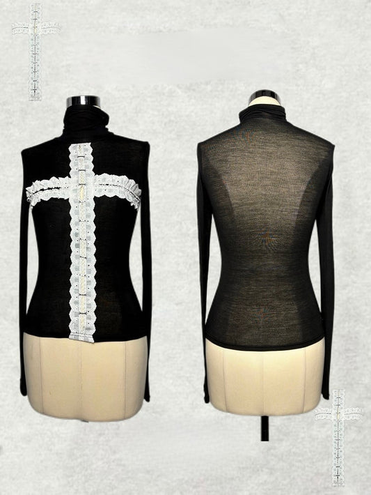 Gothic Sleeves Black Top with Long Options Motif Regular/Thinner High Cross Neck - Decorative