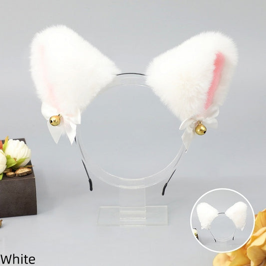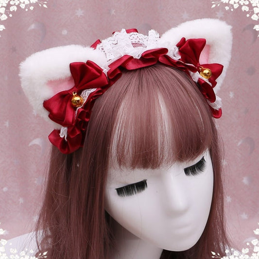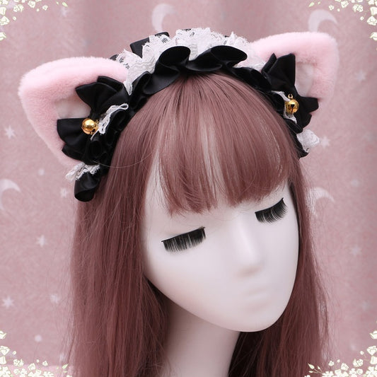 Bell Decorated Lace 4 Ears Bow Colors KC Kitty Pink with Cute Plush White Lolita