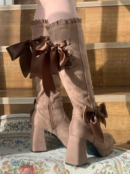 Design Lolita Details Lace-up with Back Knee-high Bow Khaki Boots Decorative Elegant