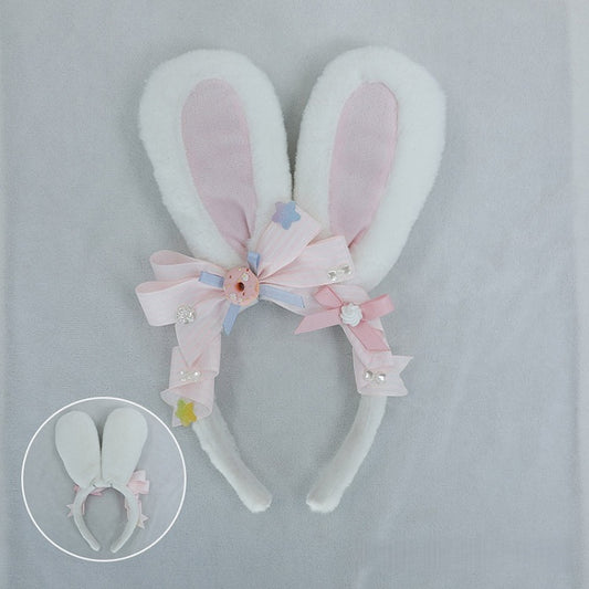 / White Cute and Bow Bunny Ear KC Plush Lolita Donut Decorated Pink