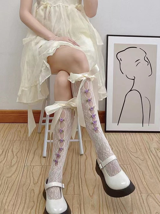 Decorations Apricot/Purple Rose 3D Lace Calf with Ribbon Socks Creamy White Cutout Bow Lolita