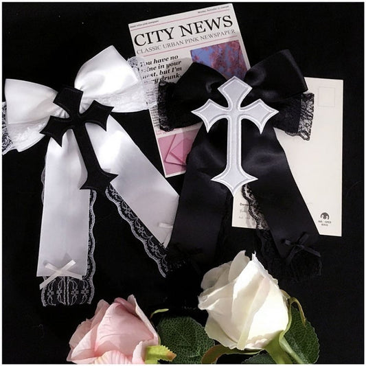 Cross Hairclip with Black/White Bow Lace Trim Decorated