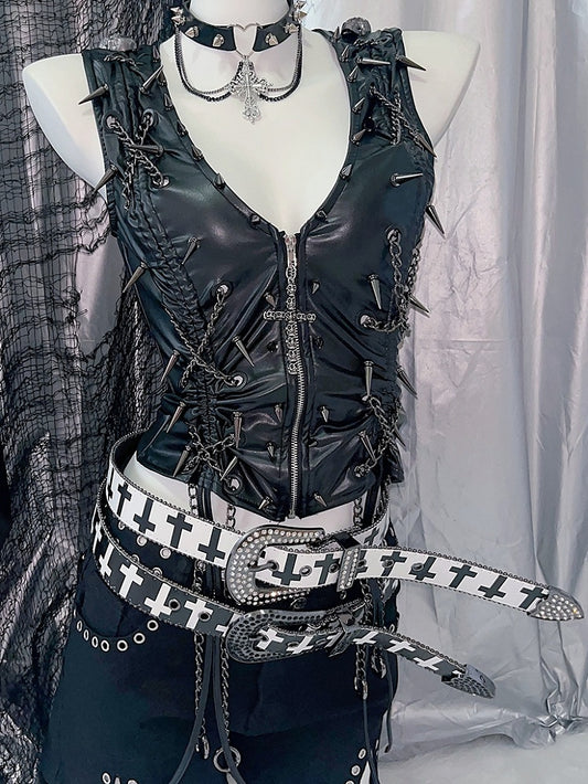 And Black Closure Studs Decorated Zipper Cross Charm Skeleton Y2K