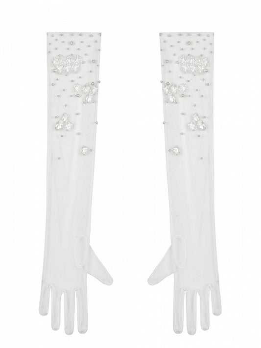 Gloves Decorated and Beads White Tulle Flowers
