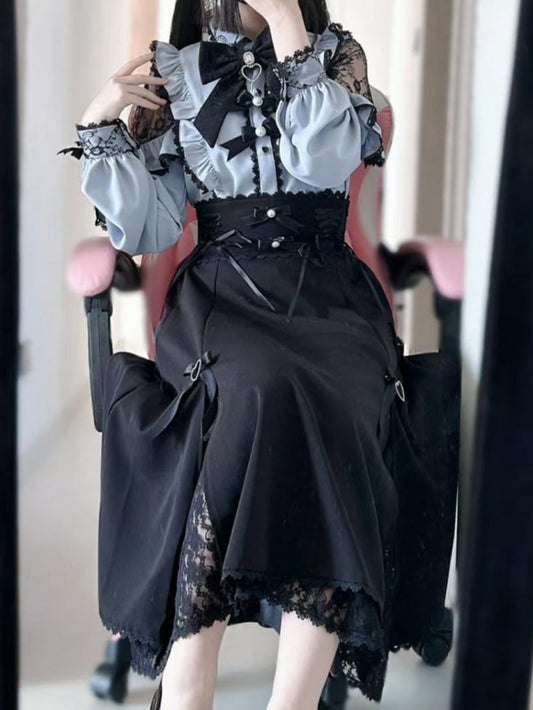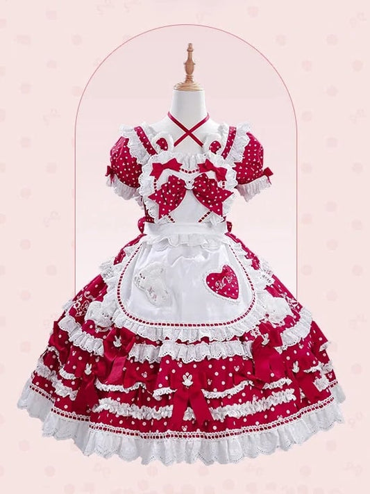 Sweet Heart-shaped Black Lolita Bows Apron Blue Red Bodice / Pink Decorated