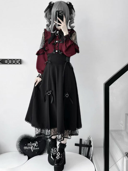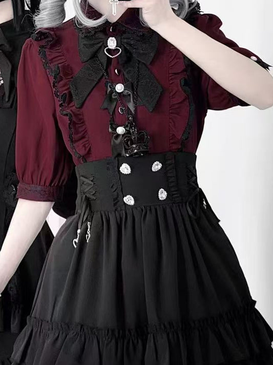 Rhinestone Ruffles Shirt Details Bowknot Decorated Jirai Red Wine Kei Trim