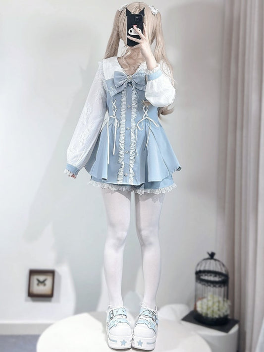 Lace Lace-up Sleeves Trim Light Decorated Details + Long Blue Shorts Kei Top Bowknot Outfit-Beaded Jirai
