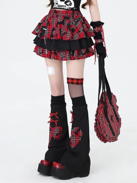 Punk Sleeves with Red Rock Decorated Chain Tiered Free Plaid Black and Skirt Leg