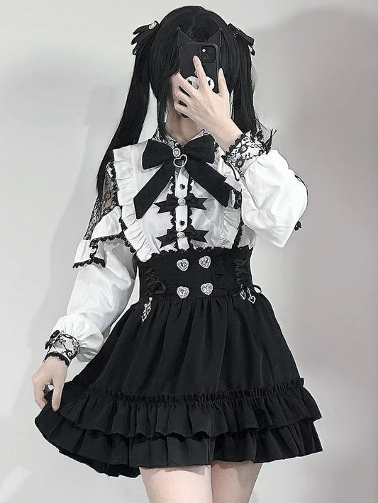 White Trim Jirai Rhinestone Details Kei Bowknot And Blouse Decorated Beaded Ruffles