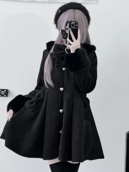 and Kei Plush Beaded Black Bowknot Collar Decorated Cuffs Details Jirai Coat