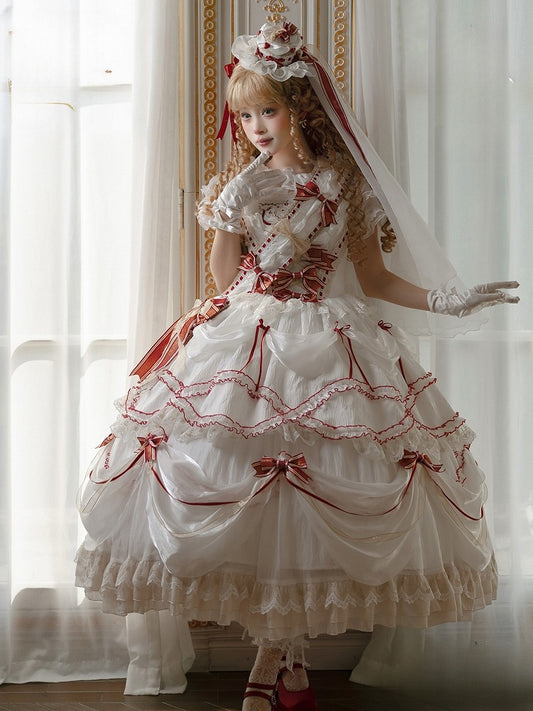 Decorated Lolita White Bowknots Sash Red