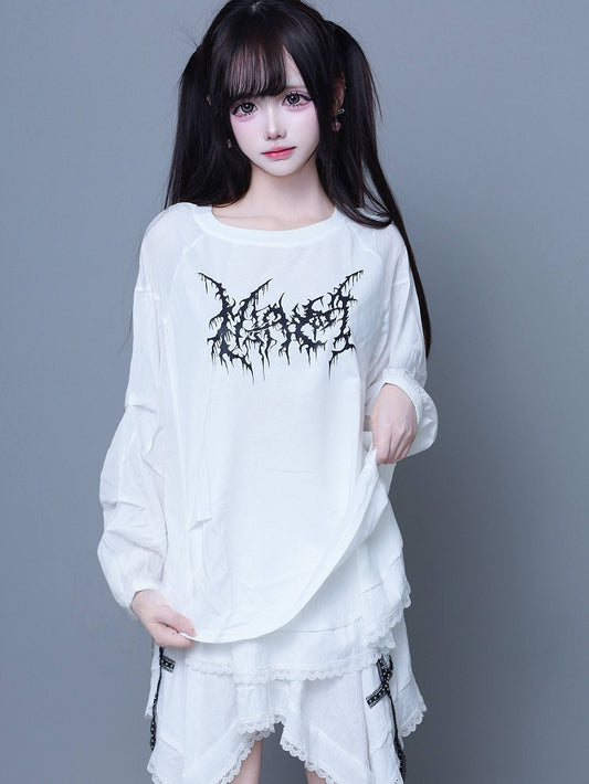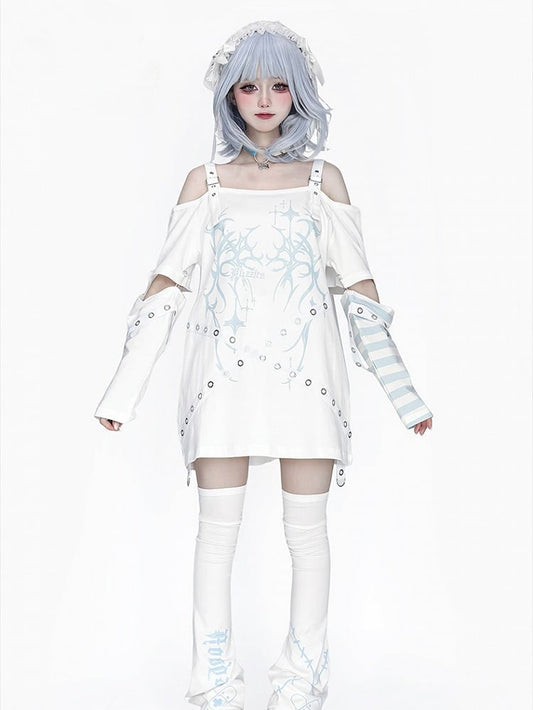 Blue wit Kei Decorations T-Shirt Printed Shoulder Cutout White Jirai Strap