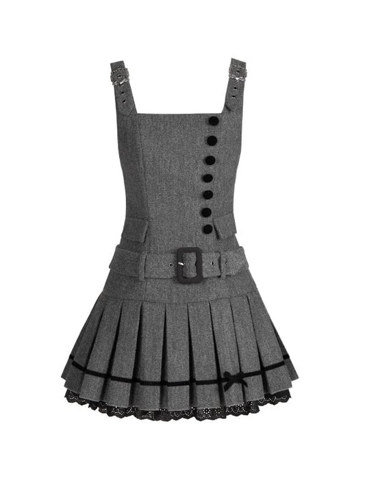 Box with and Pleat Short Belt Gray Faux Pockets Low-Waist Dress Chic Decorative