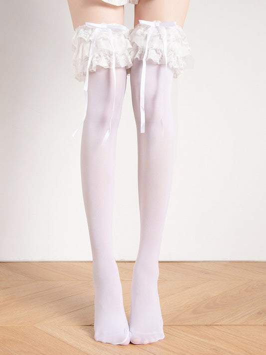 Creamy Multi-Layer Large White/White/Black Stockings Bow Ruffle Decoration Lolita Lace with