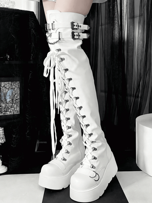in PU Matte Over Style Clasps with White Punk Boots Decorative Zip Length Closure Inner Platform Knee
