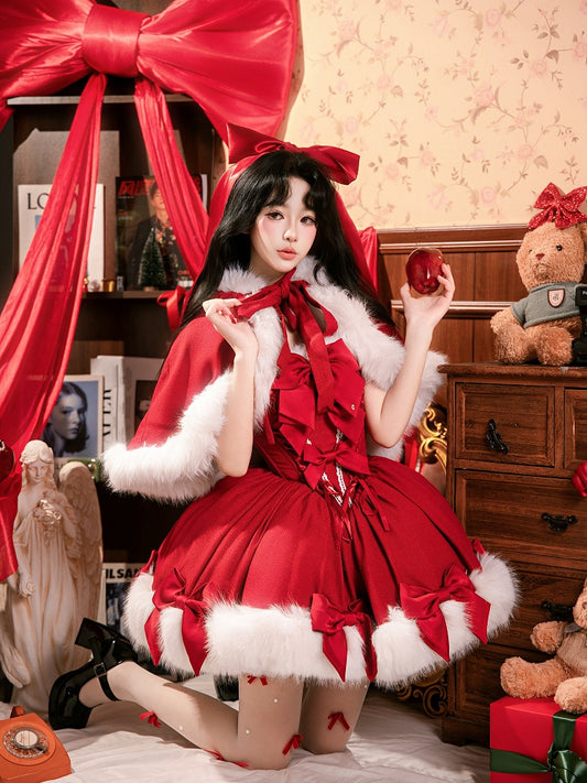 Dress Cape + Full Set Red Christmas Boning and Neckline Bows Decorated Hemline Plush