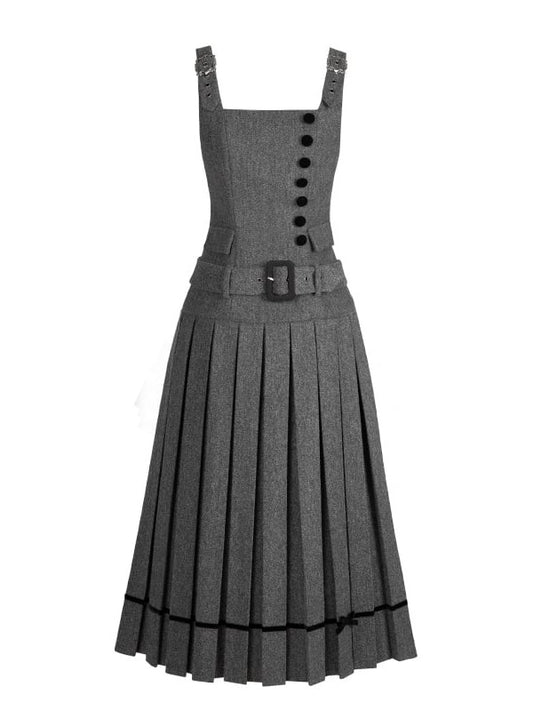 Belt Pleat Elegant and Box Low-Waist with Gray Pockets Chic Faux Decorative Dress