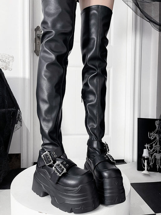 Zipper Boots Knee Platform High Decorative Black - Buckle Punk Matte Side Details Inner