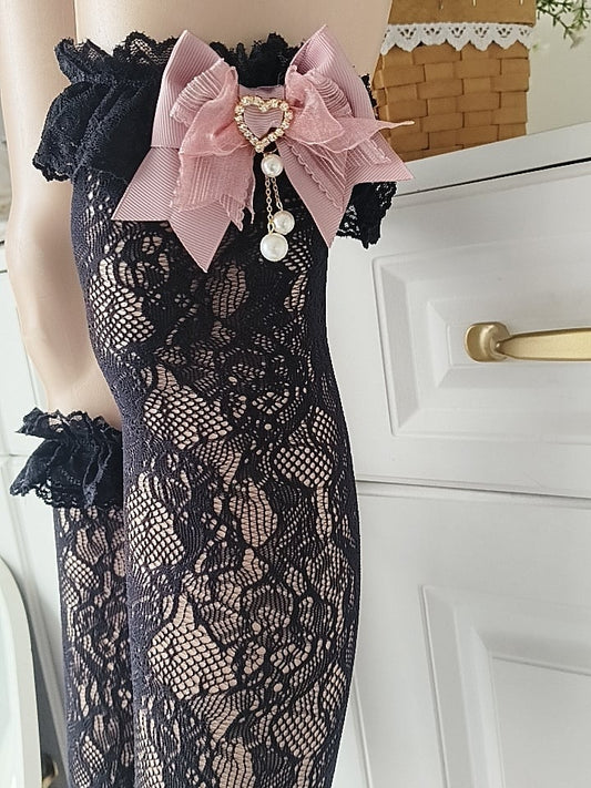 Suspender Bow Decorations Lace Fishnet Black Stockings with