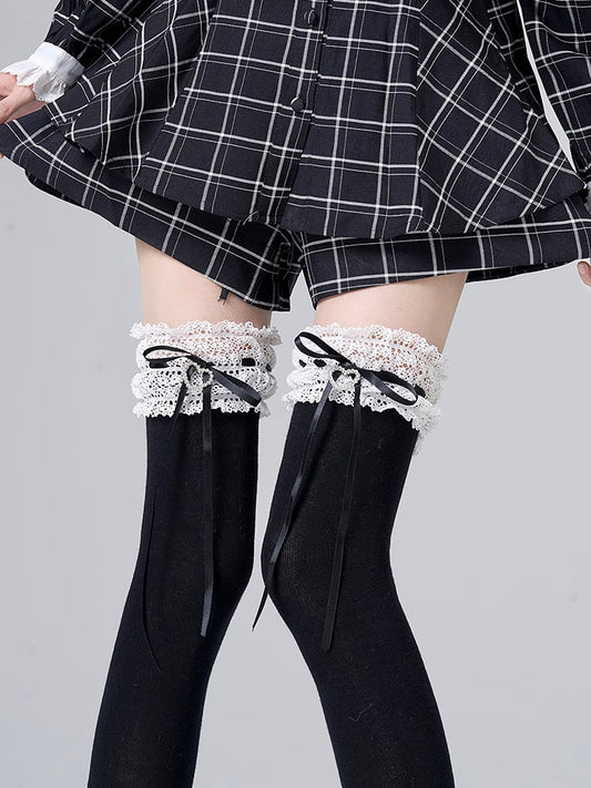 Decoration Lace Bowknot White/Black with and Trim Calf Lolita Socks