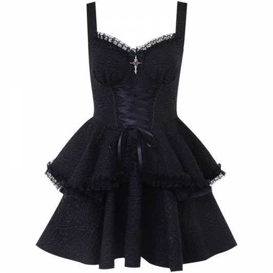 Skirt Gothic Black Sweetheart Neckline Lace-up Front Tiered