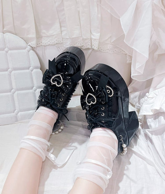 Jirai Kei Polished Black Lace Trim Heart Bow Platform High Block Heels with Beaded Chain