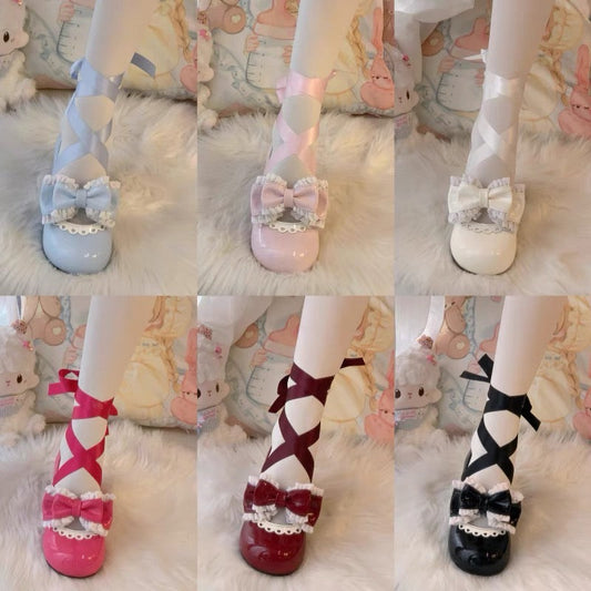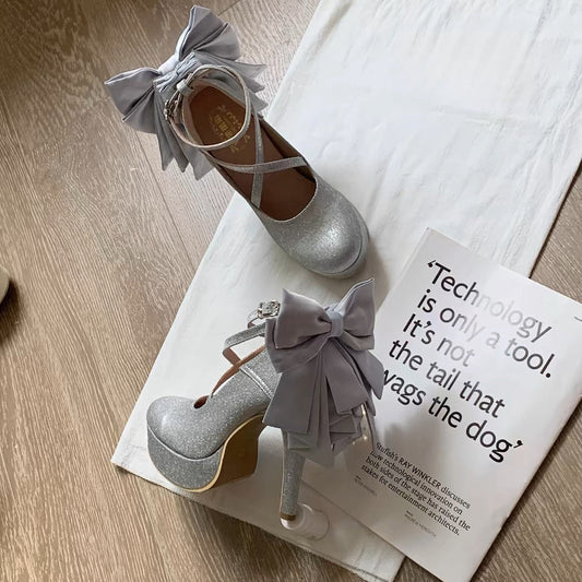 Milk White Bowknot Stud Butterfly Platform High Block Heels Lolita Shoes