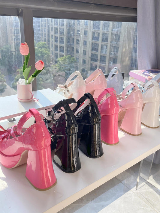Pink Bowknot Stud Butterfly Platform High Block Heels Lolita Shoes