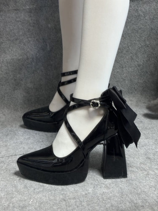 Gothic Black Detachable Bowknot Crisscross Buckle Strap Platform High Block Heels