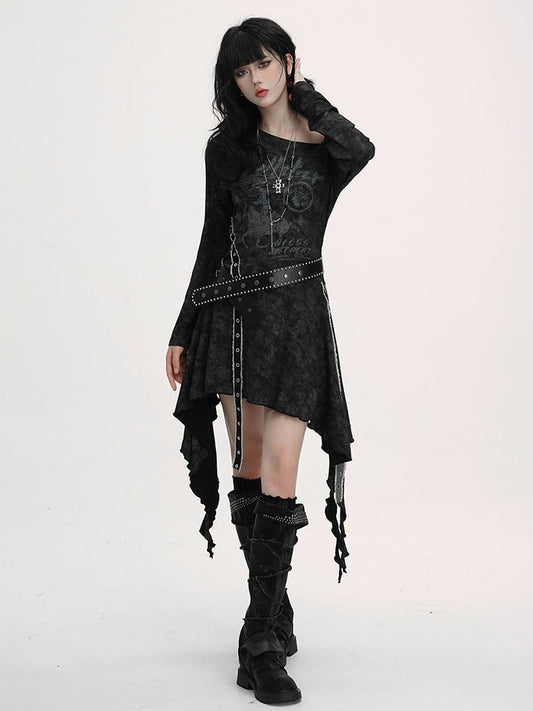 Equestrian with Handkerchief Neckline Asymmetrical Belt Black Gothic Studded Dress Hem