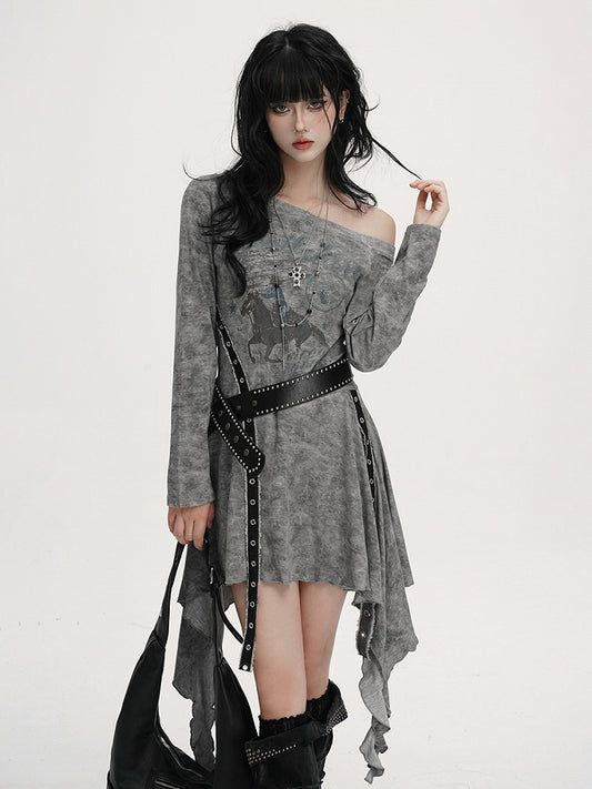 Gray Tee Oversized Print Gothic Sleeve Swallow Long Off-Shoulder