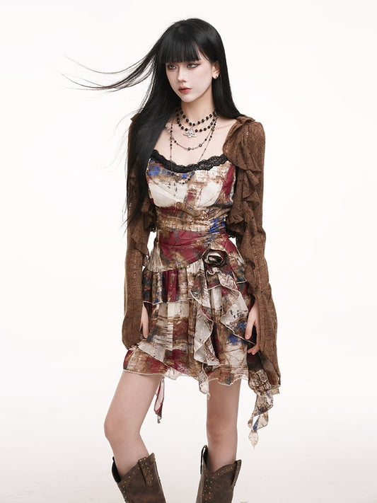 Cascading Trim Ankle-Length with Gothic Dress Gray Ruffle A-Line Tie-Dye