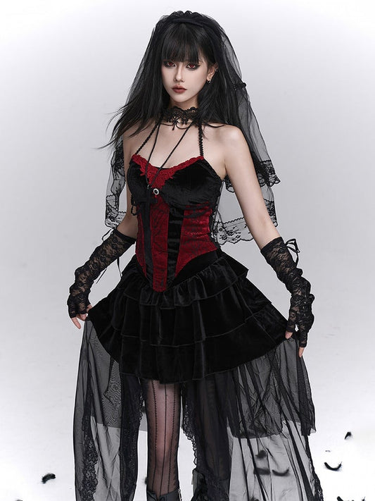 Halter Bustier Halloween Gothic Print Red with Top Black Spiderweb Neck