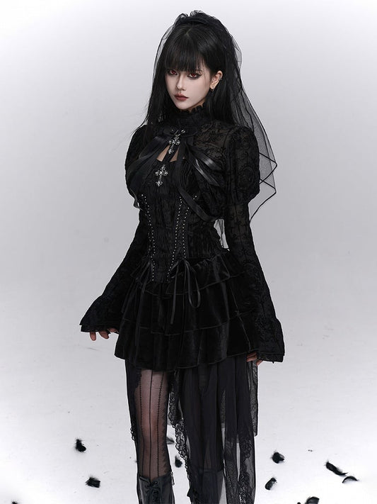 with Black Shrug Bell Sleeves Crop Lace-Trimmed Closure Gothic Cross-Tie