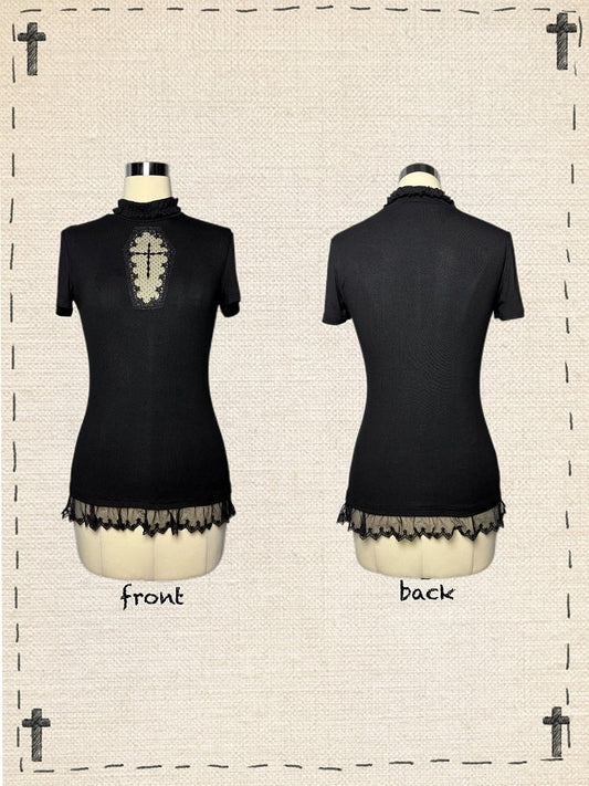 Gothic Black/White Mock Neck Coffin-Shaped Cutout T-Shirt