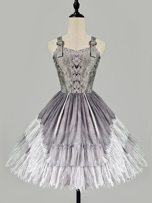 Dress Skirt Panel Buckle Gray Feather Shoulder Lolita Lace Gothic Straps