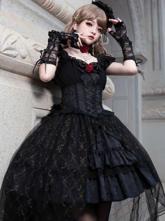 Black Drawstring Detail Gothic Lolita Layered Skirt