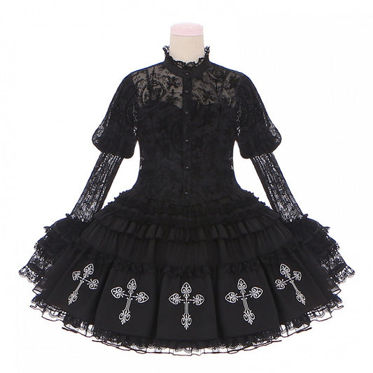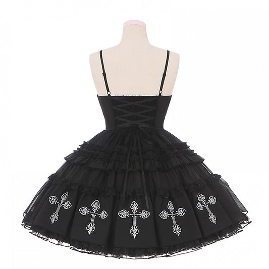 Kuro Black Cross Print Lace Trim Gothic Lolita Puffy Dress Jumper Skirt