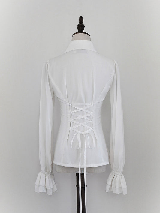 White Cascading Ruffle Pointed Foldover Collar Gothic Lolita Long Sleeves Shirt