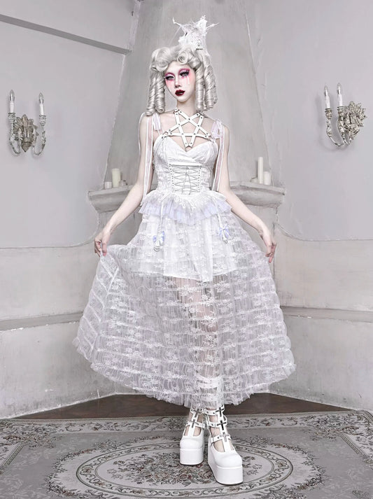 Mesh Sleeping Pentagram Gothic Lace Suspender White Alice Dark Dress