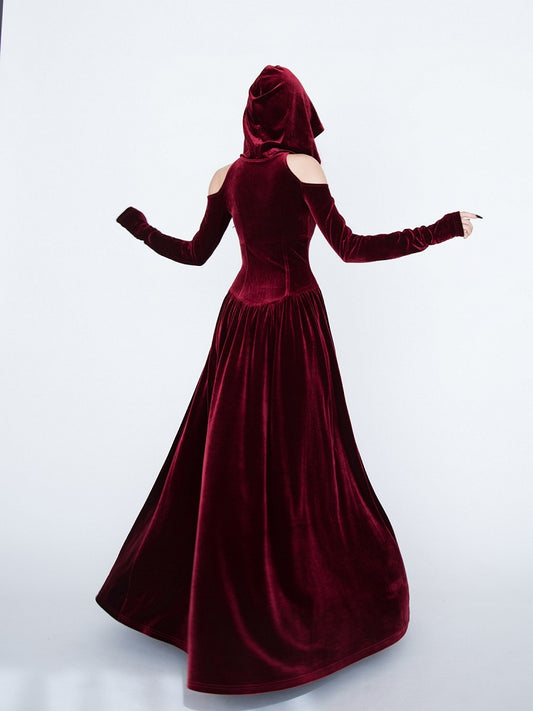 Medieval Witch Red Velvet Cutout Shoulder Gothic Vampire Hooded Dress
