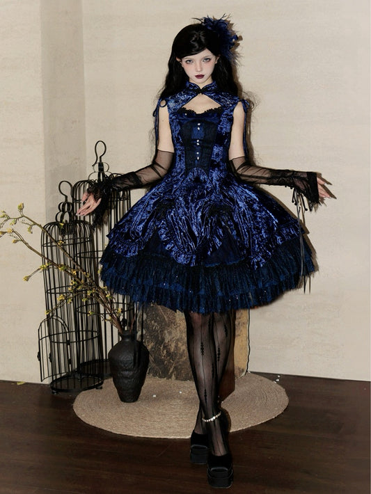 Dark Blue Gothic Lolita Velvet Tassel Knot Button Drawstring Skirt