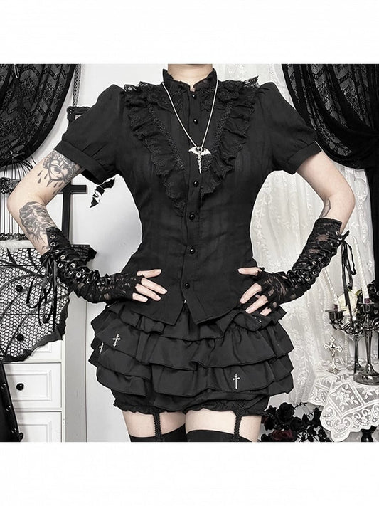 Short with Ruffled Collar Ruffle Black Gothic Sleeve Halloween Shirt