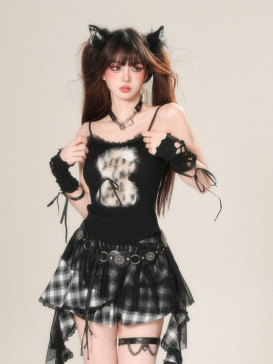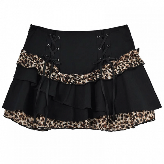 Y2K Black Leopard Pattern Mini Tiered Skirt with Details Glamorous Lace-up